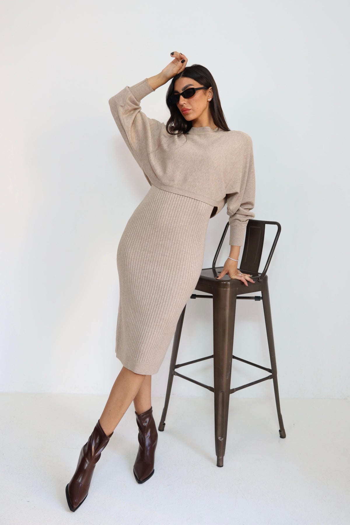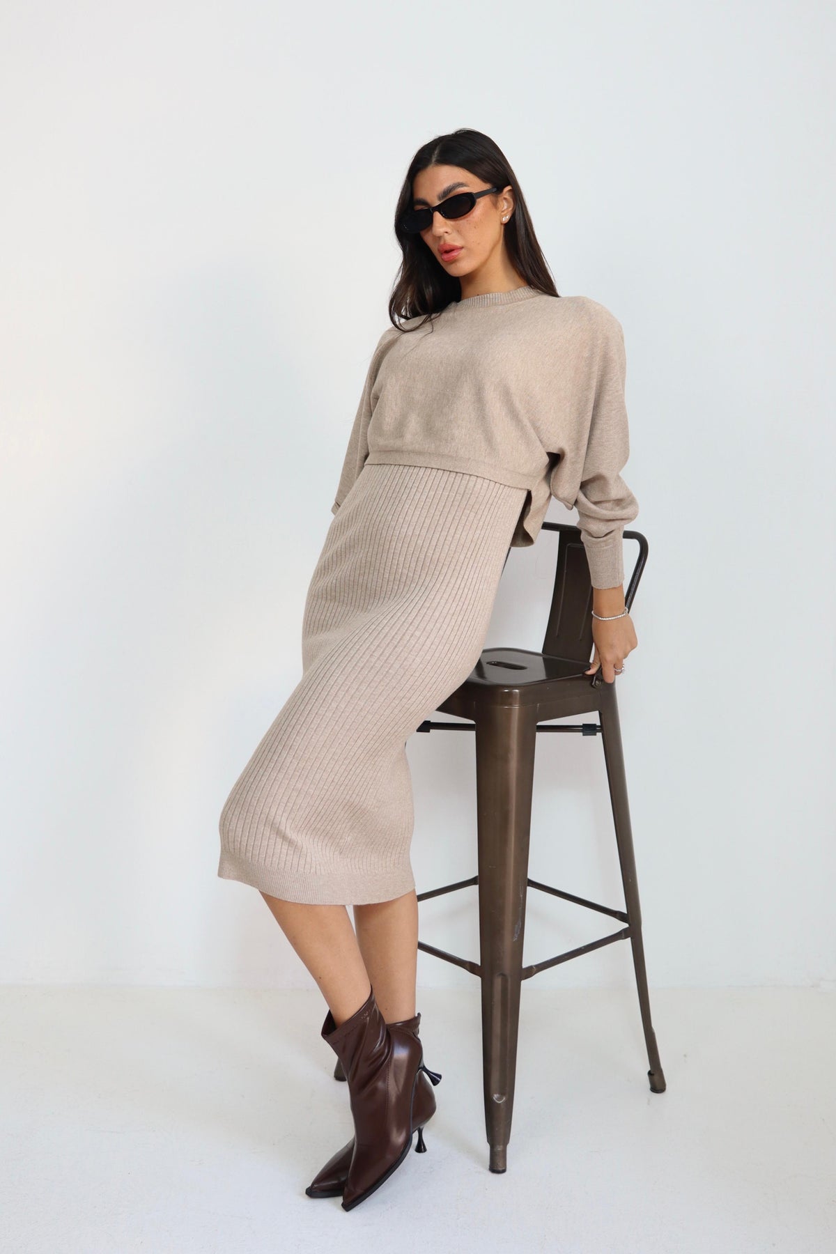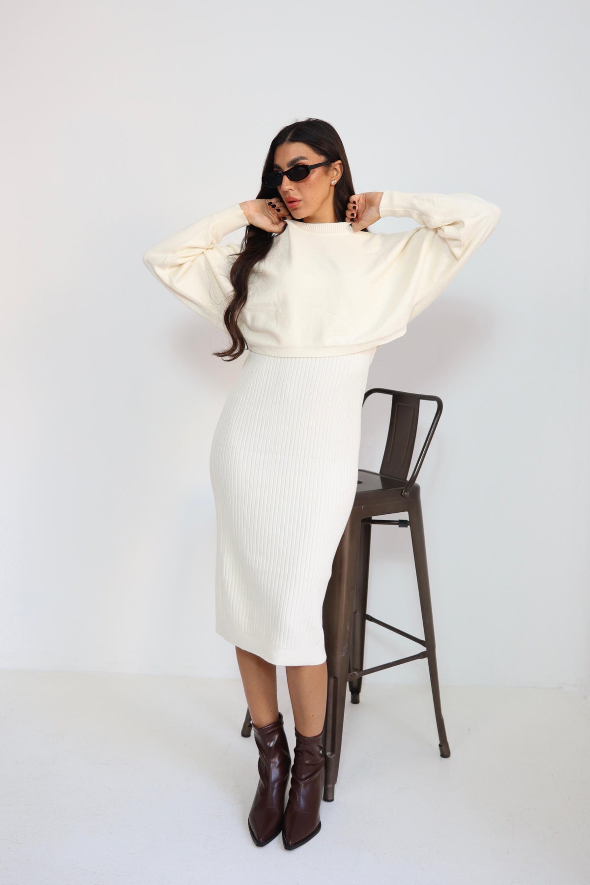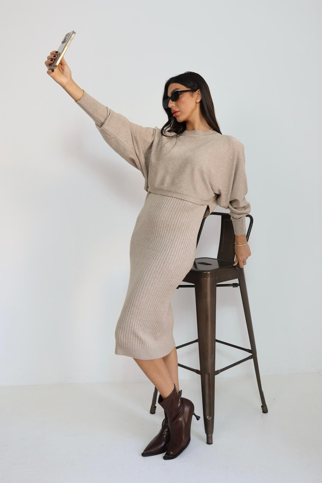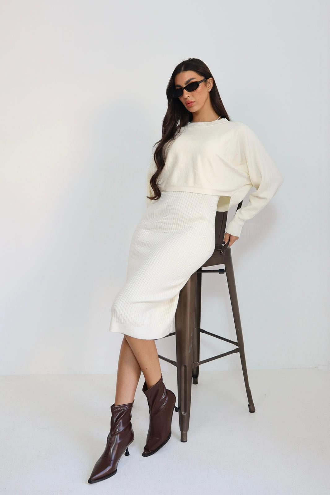 סט שמלה גופיה + חולצה קצרה בד סריג