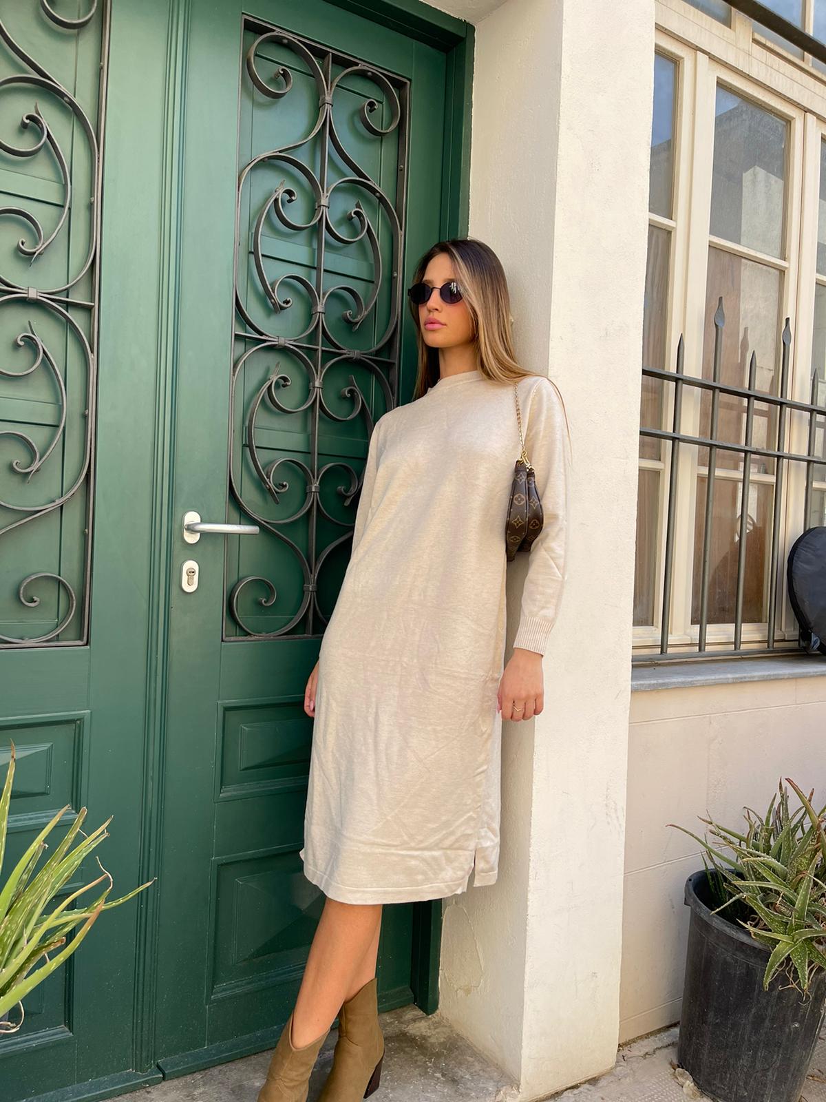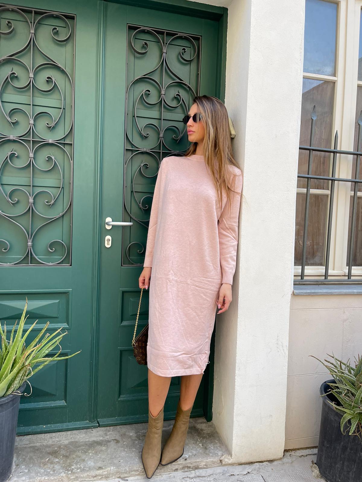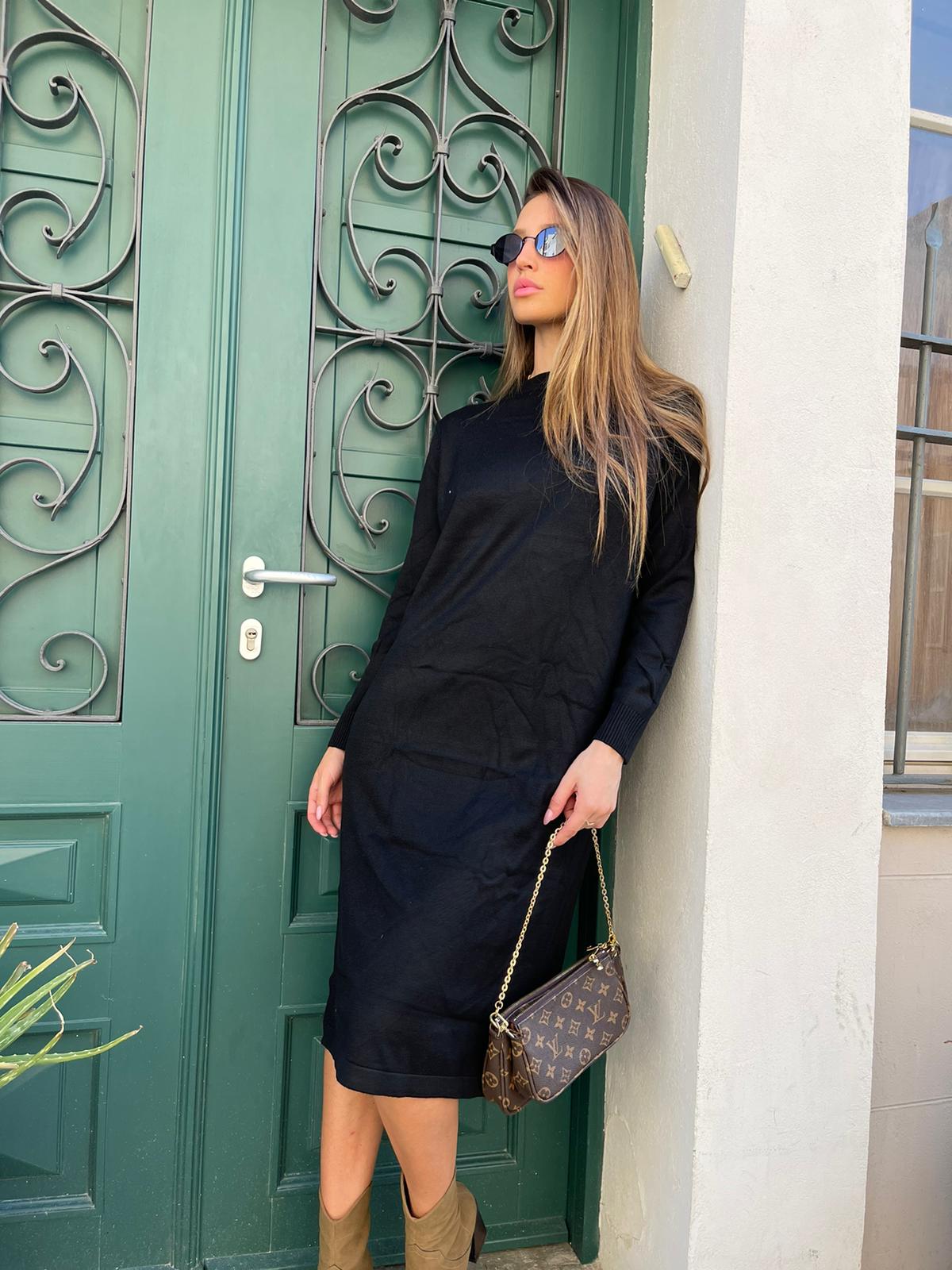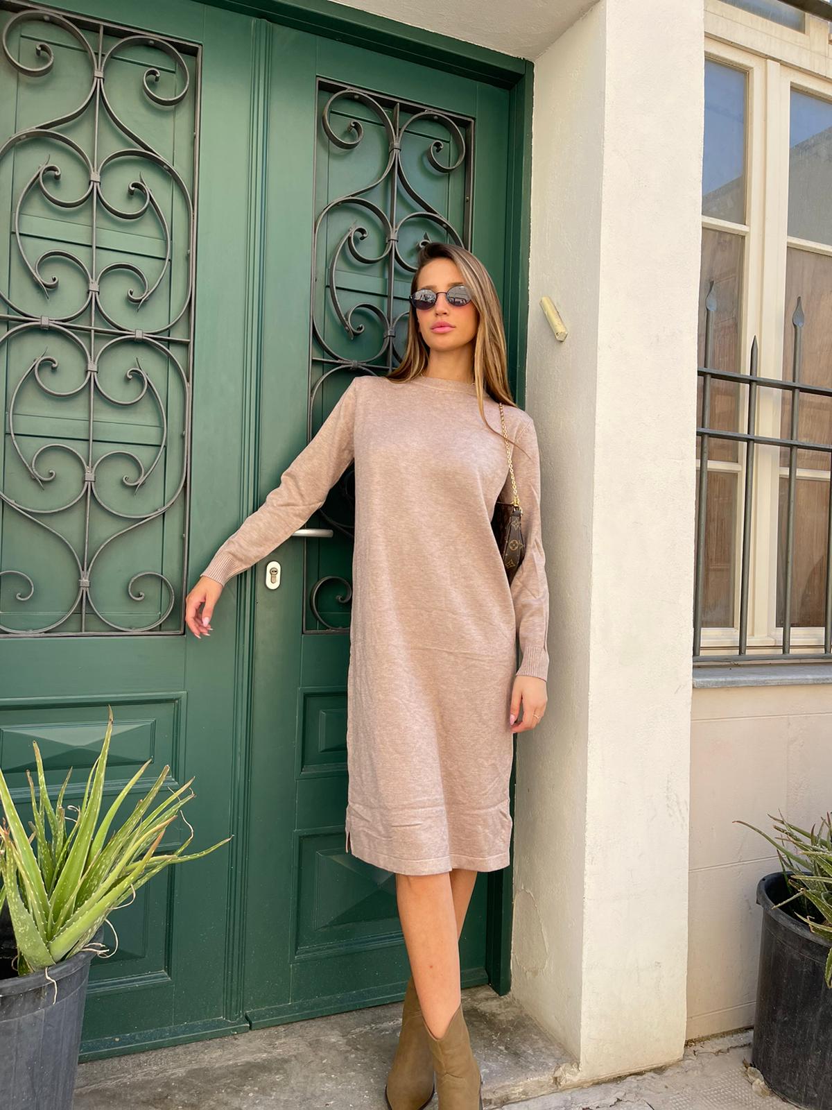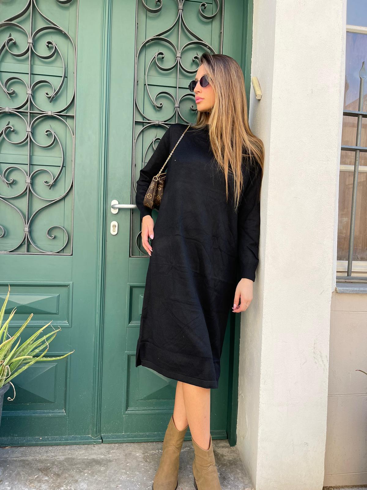 שמלה מבד סריג מפתח עגול גזרה מידי ישרה חלקה עם שסעים בצדדים שרוולים ארוכים